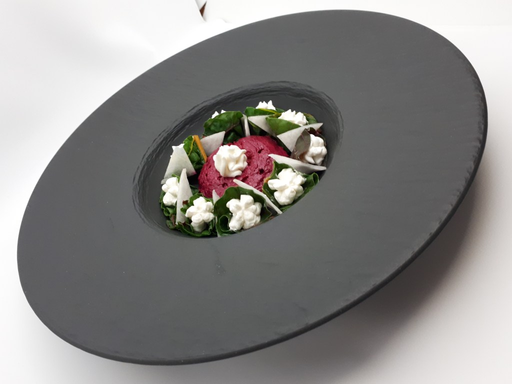 Per la salsa di barbabietola mettiamo tutti gli ingredienti in un frullatore e frulliamo rendendo liscio il tutto. A questo punto prendiamo la nostra rapesta e con l’aiuto di un pelapatate togliamo la buccia e usando una mandolina otteniamo delle lamelle che passiamo qualche secondo in acqua minerale ghiacciata. Queste ci daranno la nota croccante al piatto.