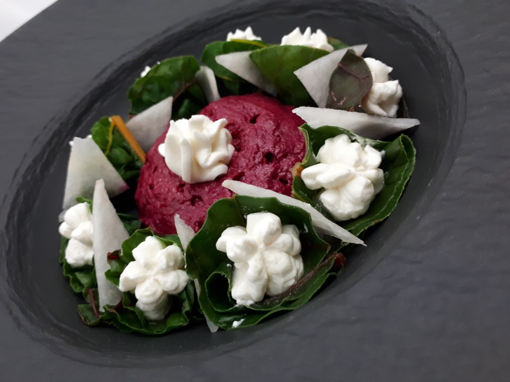 Anche la posizione della barbabietola in questo piatto svolge un ruolo molto importante, sia per il sapore terroso, sia per le sue proprietà, ricca di zuccheri, sali minerali e vitamine. Ha proprietà dietetiche e salutari: assorbe tossine favorendone l’eliminazione, favorisce la digestione, è depurativa, antisettica, stimola la produzione di bile e rafforza la mucosa gastrica, cura le anemie, le infezioni del sistema nervoso e stimola la produzione dei globuli rossi e del sistema linfatico.