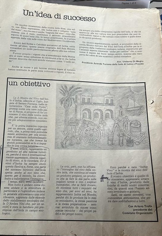 Dalla documentazone siamo venuti a conosceza che, l’iniziativa “Andar per Cantine” era inclusa nell’edizione “Ischia Vino” una manifestazione riguardante la valorizzazione dei nostri vini, che veniva allestita al borgo del Ciglio nei pressi della casa sulla pietra.