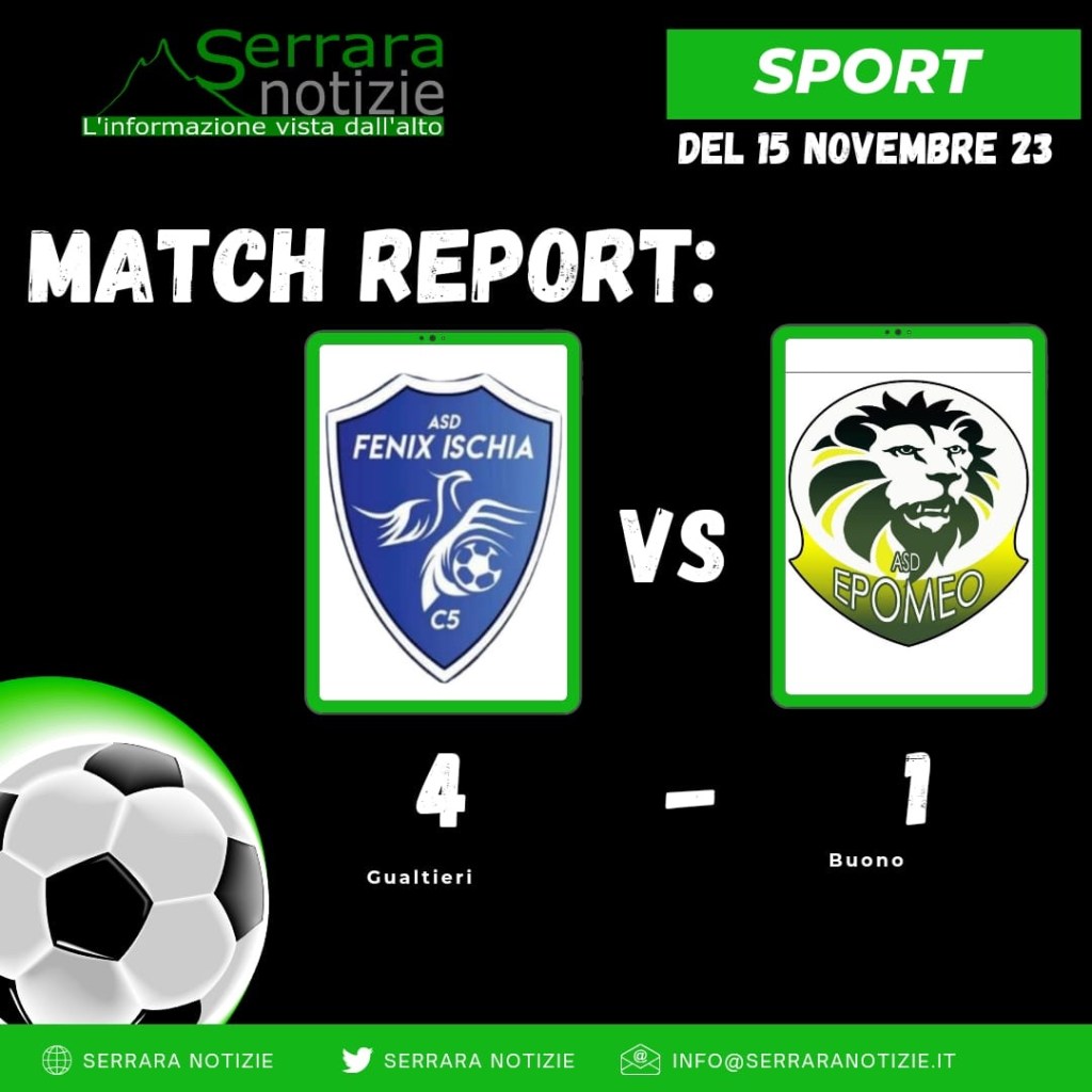 Dopo due minuti la Fenix cala il tris. Gualtieri approfitta di un errore di Buono si invola verso la porta con una finta supera un difensore e batte il portiere e fa 3 a 1. L’Epomeo accusa il colpo e non riesce a reagire. Per alcuni minuti la gara è stata fermata per una rissa fra i vari tesserati, a farne le spese sono stati Vuoso e Castagliuolo per l’Epomeo entrambi espulsi. Al posto di quest’ultimo entra Trofa che è super al 18 minuto su Gualtieri che, da pochi metri non firma il poker. Buono prova a scuotere l’Epomeo ed al minuto 24 non trova il 3 a 2 da ottima posizione calciando fuori. Ma la Fenix al minuto 24 prova a chiudere la partita: Trofa è ancora super su Gualtieri deviando la sua conclusione in angolo. Negli ultimi minuti anche Vieira ci prova ma ancora Trofa dice no, ma non può fare nulla sulla conclusione di Gualtieri che al minuto 32 della seconda frazione cala il poker per la Fenix e firma la sua tripletta portandosi il pallone a casa. Suo il tap in su una conclusione di Cirillo respinta da Trofa, è 4 a 1. Nell’ultimo minuto di recupero Buono si fa parare un tiro libero da Cirillo e cosi termina la gara dopo tre minuti di recupero. Dopo il buon filotto di gare si interrompe la striscia positiva di Mister Vuoso e dei suoi ragazzi, certificando un netto passo indietro a cospetto di una grande formazione qual’è la Fenix Ischia, che con questa meritata vittoria vola in testa da sola alla classifica.