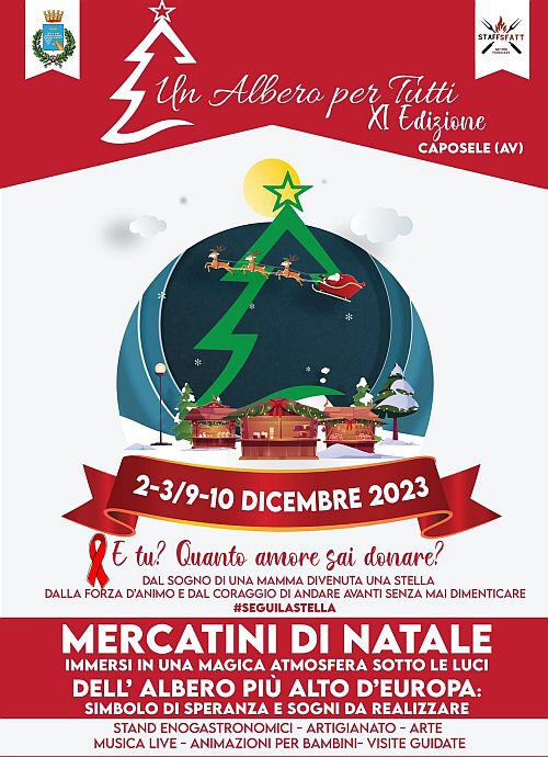 Descrizione: I Mercatini di Natale di Caposele (AV) presentano l’accensione dell’Albero di Natale più alto d’Europa: 33 metri di altezza e oltre 2 km di luci per scaldare il cuore del centro storico del piccolo paese Irpino. L’albero verrà illuminato nel Parco della Sanità. Sarete immersi in tantissimi stand ricolmi di prodotti tipici (olio extra vergine di oliva, muffletto, amaretti, vini locali, miele, prodotti caseari, taralli; biscotti della tradizione; tartufi; castagne; legumi; salumi, torroni) e quelli dedicati all’artigianato, dove si possono trovare sculture di legno, statuine del presepe fatte a mano, ceramiche, lavori all’uncinetto, creazioni in rame, fimo, feltro e tanto altro.