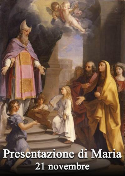 Il 21 novembre si ricorda il giorno in cui Maria, a soli tre anni, viene portata dai suoi genitori, Anna e Gioacchino, secondo la promessa fatta nel Tempio di Gerusalemme per essere offerta al signore. Maria rimase nel santuario fino a dodici anni, dedicandosi allo studio delle Sacre Scritture, alla contemplazione di Dio, imparò anche a tessere la seta e altre stoffe per poi cucire gli abiti ai sacerdoti. La giornata è stata dedicata da San Giovanni Paolo II a tutte le donne religiose e lo stesso giorno si festeggia anche la Madonna della salute.