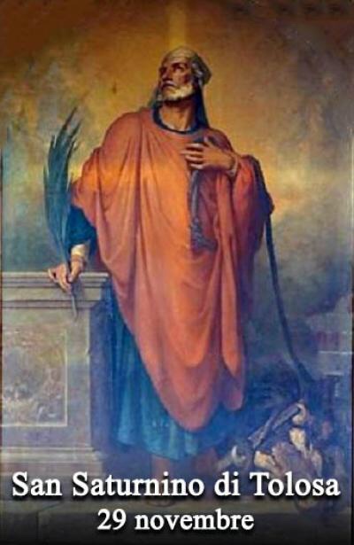 Saturnino, primo Vescovo di Tolosa, è un Santo molto conosciuto in Francia e in Spagna dov’è considerato il patrono delle corride. Nell’arco della sua vita si dedicò con dedizione alla conversione dei pagani della Gallia. La leggenda racconta che il Santo ogni mattina, per poter raggiungere il suo piccolo oratorio, doveva per forza passare davanti al Campidoglio, ovvero il più grande tempio pagano dedicato a Giove Capitolino, qui i sacerdoti pagani sacrificavano al loro Dio un toro per avere i responsi che chiedevano i fedeli. I sacerdoti si resero conto che al passaggio di Saturnino i pagani si zittivano, questo li fece molto arrabbiare e così pensarono di costringere il Santo a sacrificare un toro sull’altare di Giove, ma lui si rifiutò e per questo fu condannato a una terribile morte. Il vescovo fu legato alla coda di un toro e trascinato per tutte le vie di Tolosa. Era l’anno 250 e il martirio di Saturnino e il suo coraggio convinsero molti pagani a convertirsi.