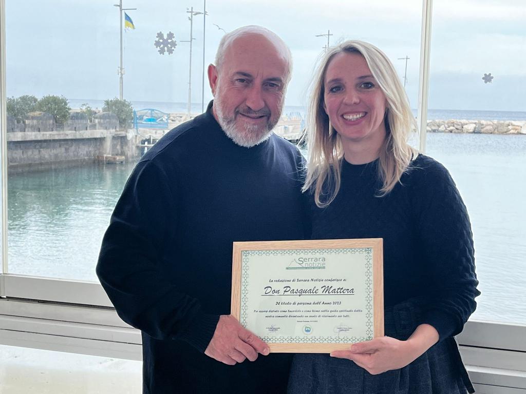 L’attestato è stato consegnato nelle mani di Don Pasquale dal Vicedirettore di Serrara Notizie Lucia Mattera.