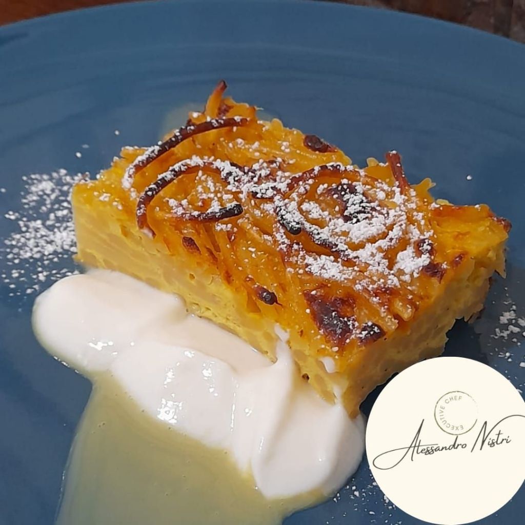 Se dovessimo darne una collocazione sociale, questo era un dolce estremamente povero e veniva preparato dai contadini con ingredienti che non mancavano mai nelle case e soprattutto per evitare che non si buttasse via nulla. Parliamo di uova, latte e semola avanzata (nel caso ischitano spaghetti). Pensate che la ricetta “primitiva” prevedeva addirittura l’uso del sangue del maiale (il sanguinaccio) a posto del latte, mescolato col miglio e uova.
