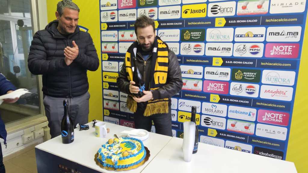 Il presidente ha anche assistito alla partita tra l’Ischia Calcio ed il Boreale, bagnando subito l’esordio in presenza con una vittoria per 2 a 0 dei padroni di casa (p.t. 46’ Baldassi (I) su rigore; nel s.t. 19’ Florio) in concomitanza con il suo 49esimo compleanno festeggiato in sala stampa in compagnia di dirigenti e collaboratori dell’Ischia Calcio.