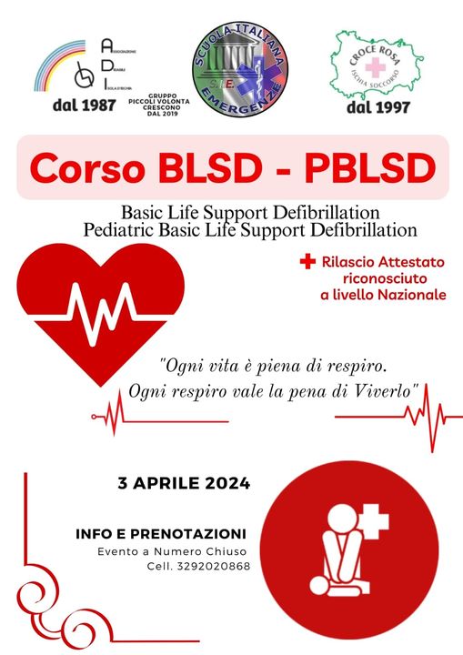 Il 03 aprile 2024, la Croce Rosa, l’Associazione Disabili Isola d’Ischia, e la Società Italiana Emergenze, organizzano un nuovo corso BLSD (Basic Life Support Defibrillation) e PBLSD (Pediatric Basic Life Supporto Defibrillation).