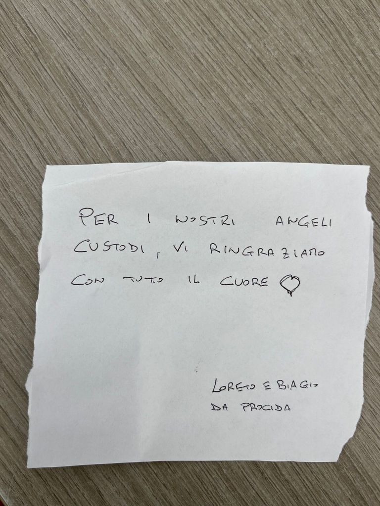 Poche parole, espresse in tutta la loro semplicità ed autenticità, scritte su un pezzo di carta che cita testualmente: “Per i nostri angeli custodi, vi ringraziamo con tutto il cuore”.