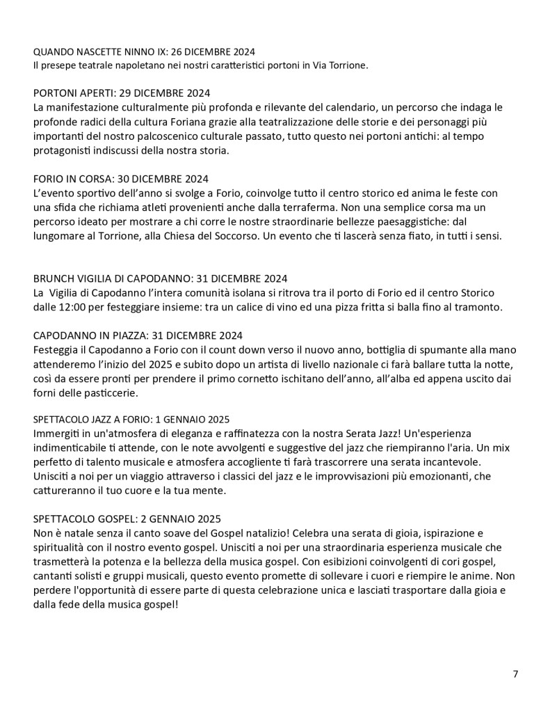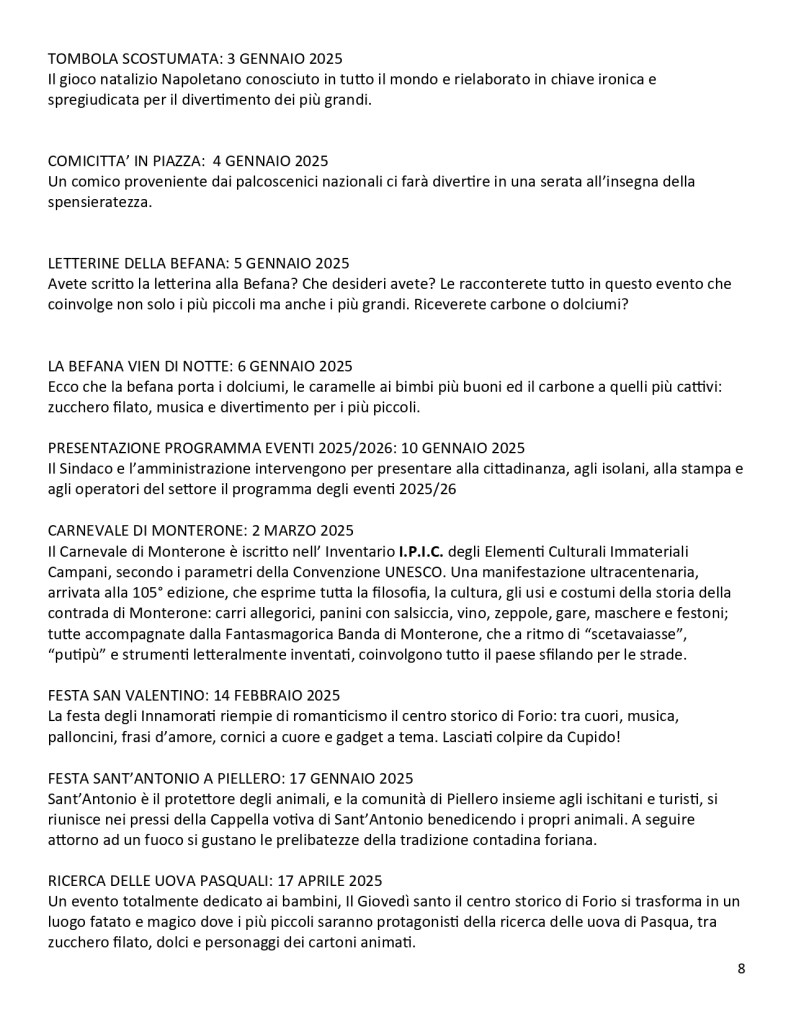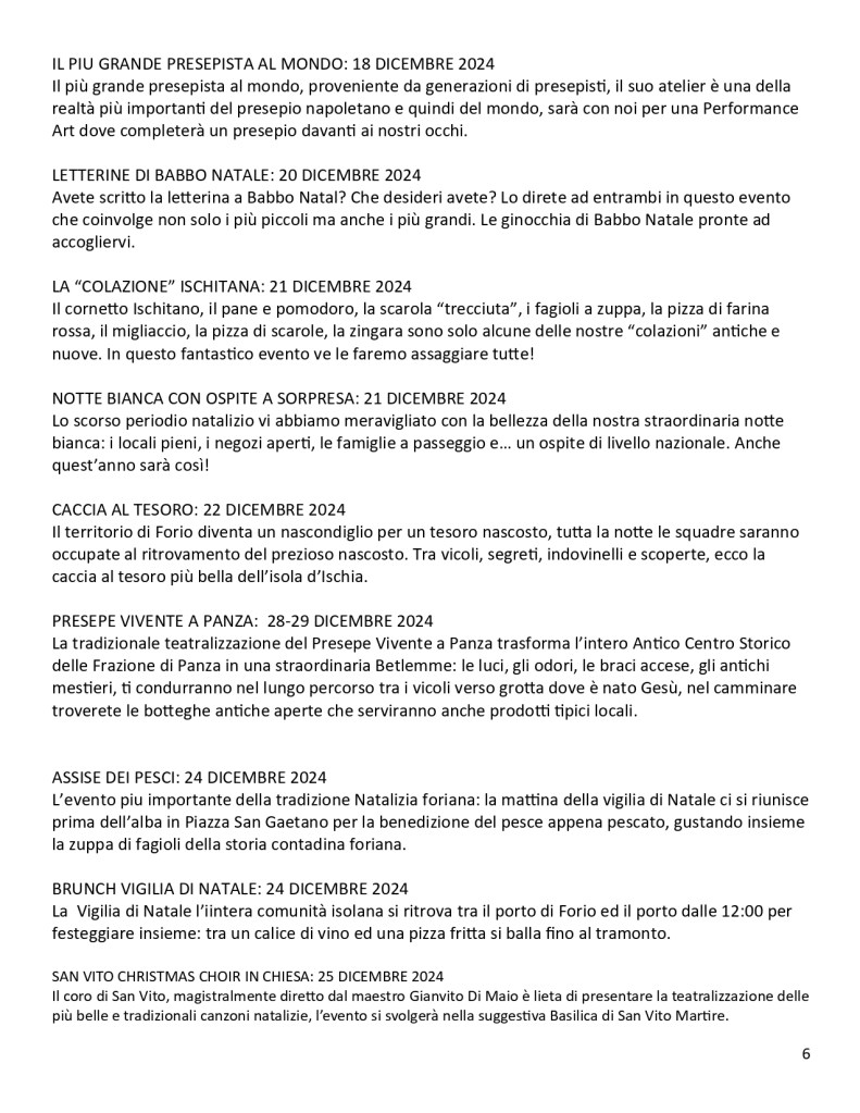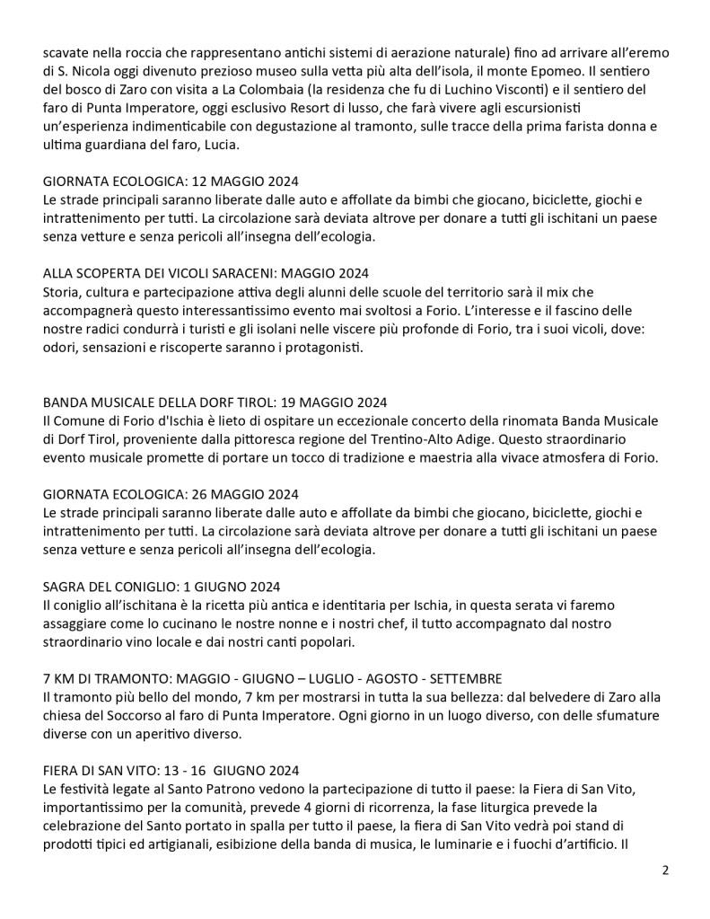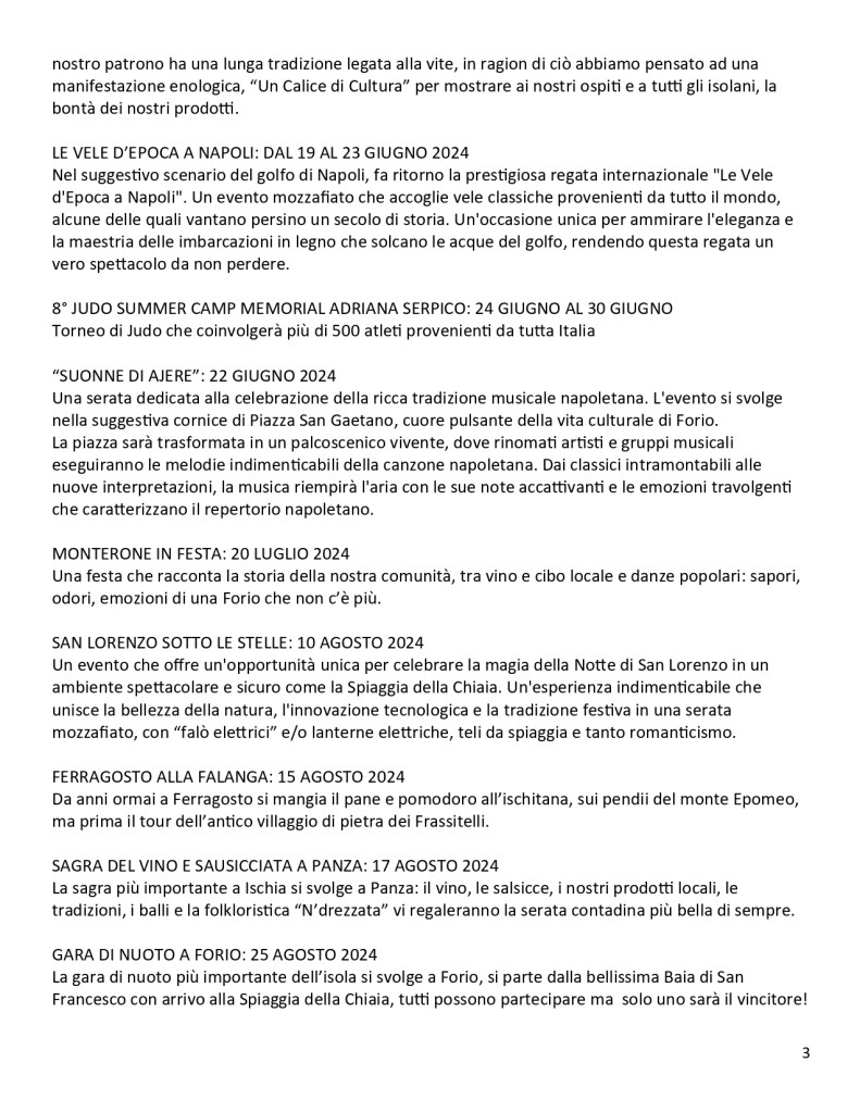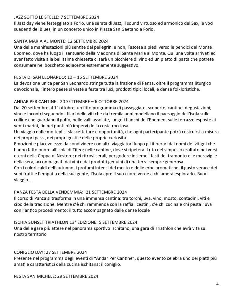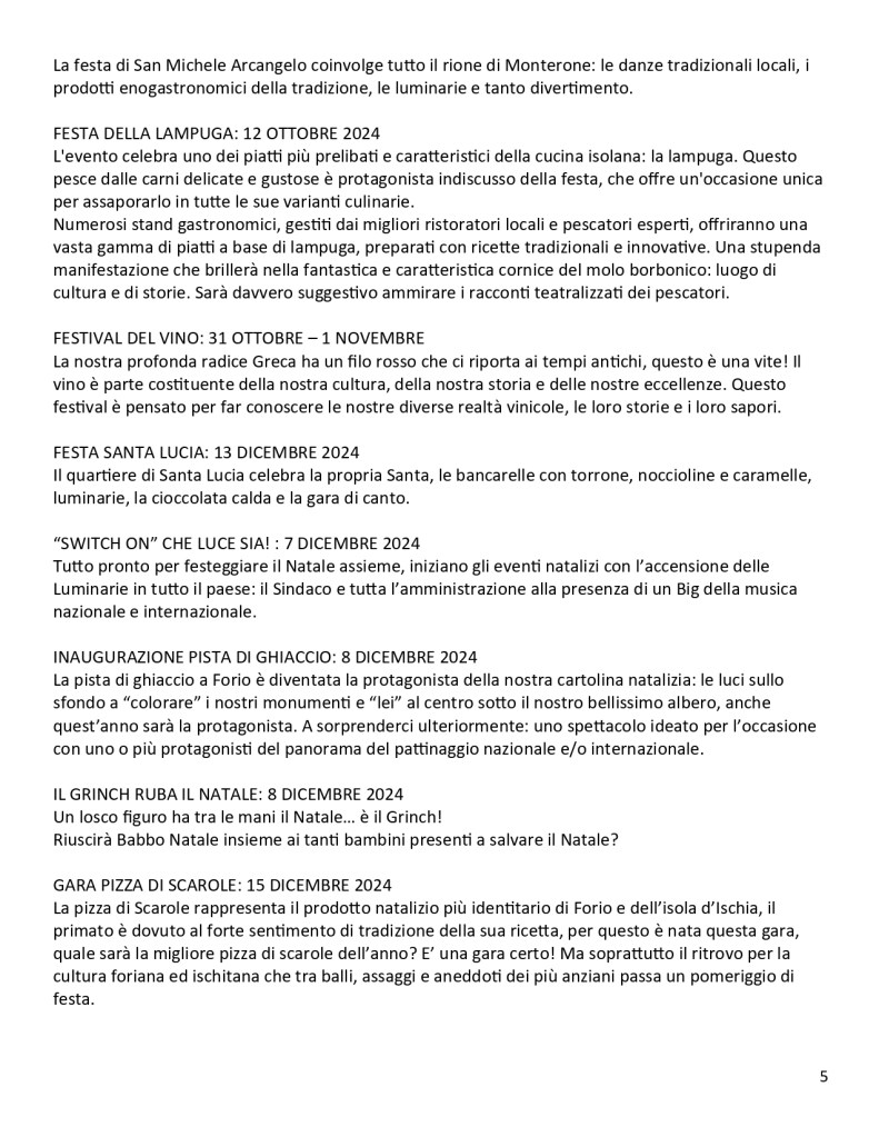 Nessuno è stato dimenticato: non lo sport, non la tradizione, non il cibo tipico e nemmeno la natura, nemmeno la musica. Ogni cosa al suo posto in una calendarizzazione di eventi che fa da matrimonio tra il mondano e il tradizionale. Così il Comune di Forio con largo anticipo calendarizza anche gli eventi del dopo-estate, dimostrando di regalare una particolare attenzione al turista così come all’abitato storico dell’isola. FORIO ha bene inteso che un’isola turistica per esserlo davvero ha la necessità di trovare una propria vocazione al bello e all’intrattenimento e così il comune abbellisce 365 giorni d’anno e istiga al divertimento e alla socialità dando luogo a manifestazioni dal carattere diverso ma molto inclusivo perché eterogeneo. Fieri di questo grandissimo lavoro (che speriamo possa costituirsi esempio anche per le altre amministrazioni isolane), lasciamo di seguito il calendario degli eventi affinché ciascuno possa trovare il suo spazio in un’isola che sull’orizzonte disegna giostre.