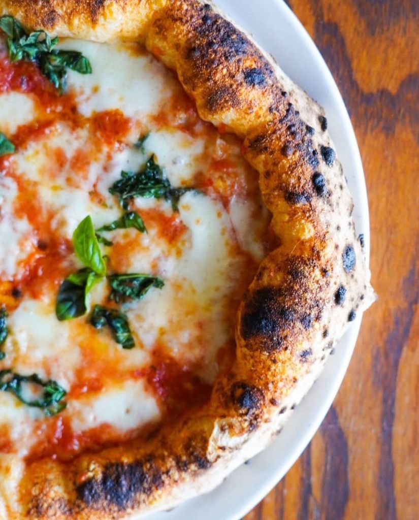 La mia pizza ideale che è quella che deve uscire “bella dal forno”, esattamente così. Perfetta in cottura, che necessita solo di un giro di olio un po’ di basilico.