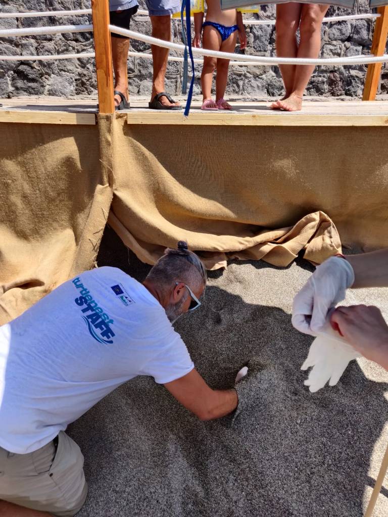 Le tracce lasciate sulla spiaggia dalla tartaruga hanno fatto scattare immediatamente il dispositivo di verifica composto dal personale dell’Area Marina Protetta Regno di Nettuno e dal Dr. Fulvio Maffucci della Stazione Zoologica Anton Dhorn supportati dalla Guardia Costiera Isolana e da Angelica e Siria collaboratrici del progetto “Caretta in vista”.