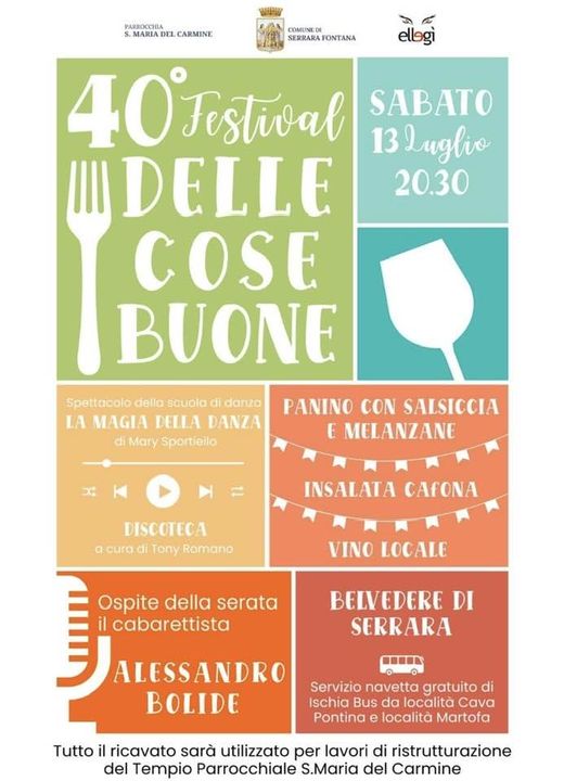 Sabato 13 luglio sul belvedere di Serrara, grazie alla Parrocchia Santa Maria del Carmine e dell’Amministrazione Comunale di Serrara Fontana si riproporrà, dopo alcuni anni di assenza, la 40ª edizione del “festival delle cose buone”. Un momento da trascorrere nell’incantevole belvedere di Serrara gustando l’ottimo panino con la salsiccia e le melenzane, la gustosa insalata cafona il tutto accompangato da buon vino locale.