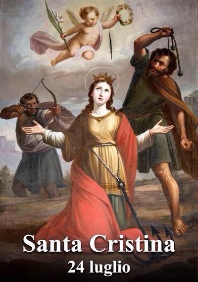 Conosciuta come “la grande martire“, titolo dato per le tremende torture a cui fu sottoposta solo perché era salda nella sua fede, Cristina il cui nome significa “consacrata a Cristo“, era figlia di un comandante delle milizie dell’imperatore di Bolsena, nel Lazio i genitori avevano previsto per lei una vita come sacerdotessa degli dei. Per convincerla a intraprendere questa strada, il padre all’età di 12 anni la fece rinchiudere in una torre insieme a 12 ancelle per fare in modo che la ragazza iniziasse a venerare statue di idoli romani d’oro e argento. Ma fu tutto vano, la giovane di una bellezza rara, era salda nella sua fede cristiana e dopo una visione di angeli distrusse le statue di idoli per poi donare l’oro e l’argento a dei poveri.