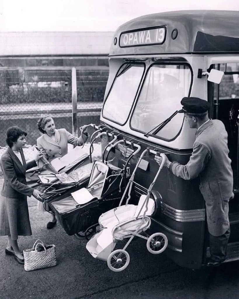 Correvano gli anni 50 , e passeggini per bambini erano fissati nella parte anteriore dell’autobus!