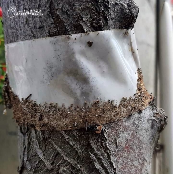 Ed è quello che ha fatto un abitante del luogo, attorno al tronco del suo albero di Giuda: ha applicato una fascia di nastro biadesivo largo 5 cm, circoscrivendo il tronco.