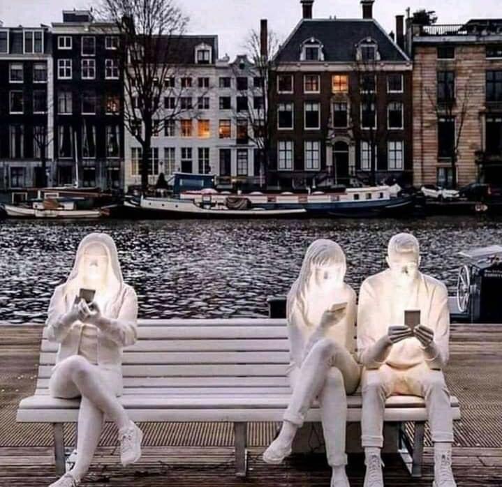 Su una panchina ad Amsterdam, tre figure immobili con lo sguardo fisso sui loro telefoni. L’artista ha chiamato questa scultura semplicemente “Dipendenza”. Un’immagine che riflette una realtà sotto gli occhi di tutti: siamo connessi, ma sempre più distanti. Persi in schermi luminosi, ignoriamo chi ci siede accanto.