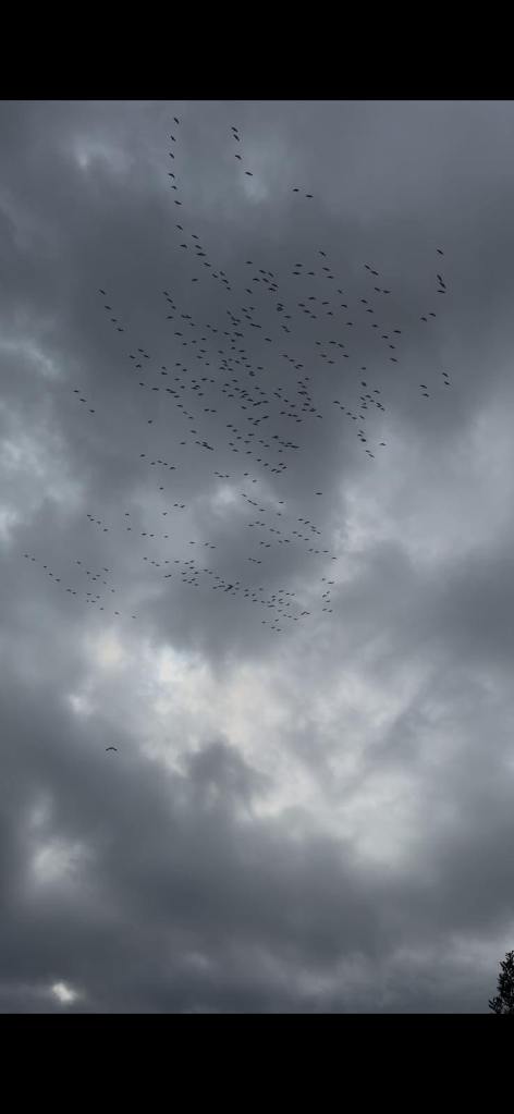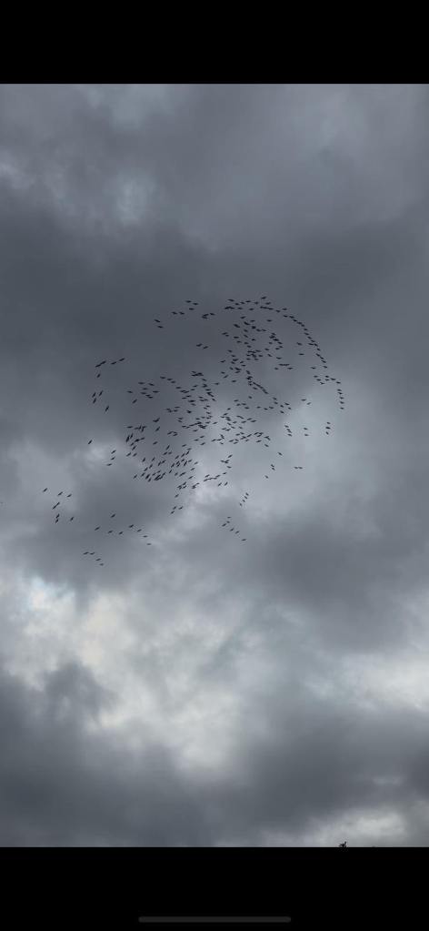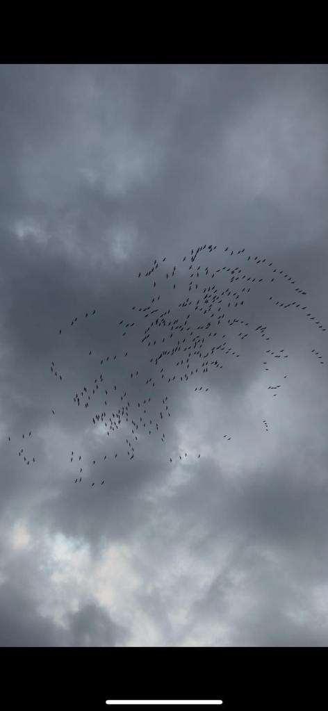 Hanno attraversato il cielo su Piazza San Rocco per diversi minuti e le loro irregolari e artistiche coreografie sono state accompagnate dai loro canti, prima di dirigersi verso ovest e scomparire.