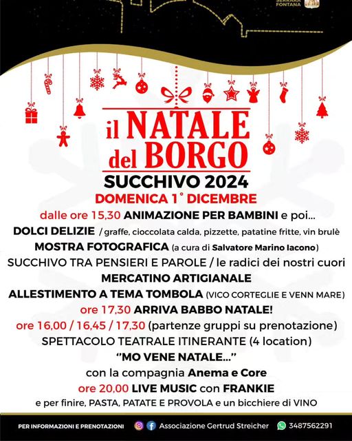 Parte domenica 1° dicembre 2024, il primo appuntamento del cartellone degli eventi natalizi nel nostro comune. E a realizzare quest’evento sarà l’Associazione Gertrud Streicher. L’appuntamento è alle 15:30 nella piazza di Succhivo dove ci saranno animazione per bambini, dolci delizie, mostre e mercatini, l’arrivo di Babbo Natale e tantissime altre sorprese fino a sera.
