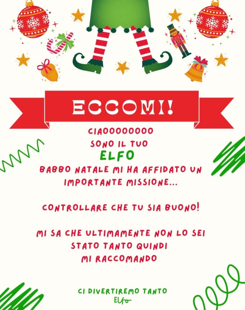 L’Elfo, che sorprenderà i più piccoli già con il suo arrivo, chiederà di far parte della famiglia per questa vacanza / missione e solo quando tutti i componenti della famiglia accetteranno la sua presenza gli si potrà dare un nome.