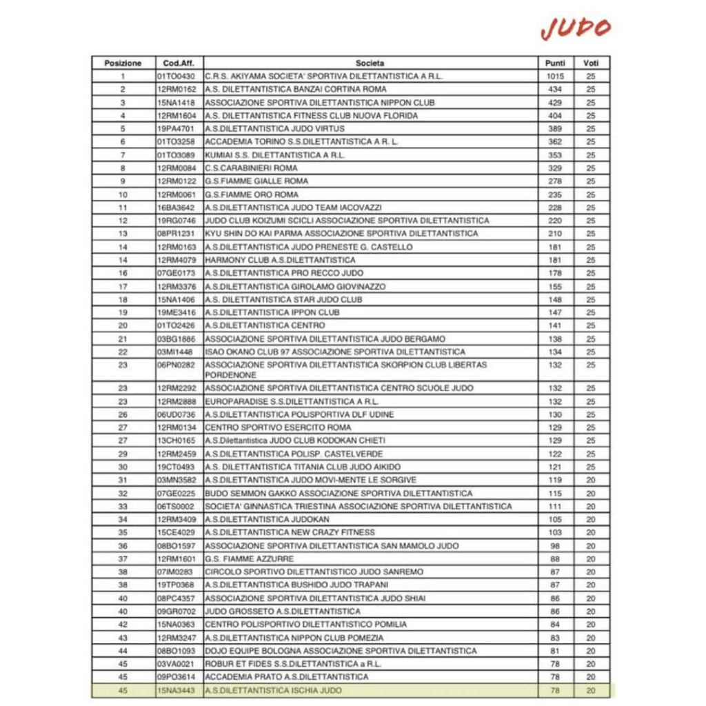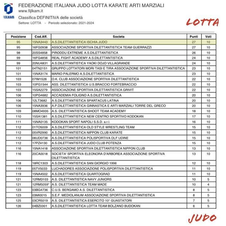 Grande traguardo riconfermandosi fra le società più forti D’Italia sia per il Judo che per la nuova disciplina Lotta intrapreso da un solo anno con un punteggio di 300 Voti totali.
