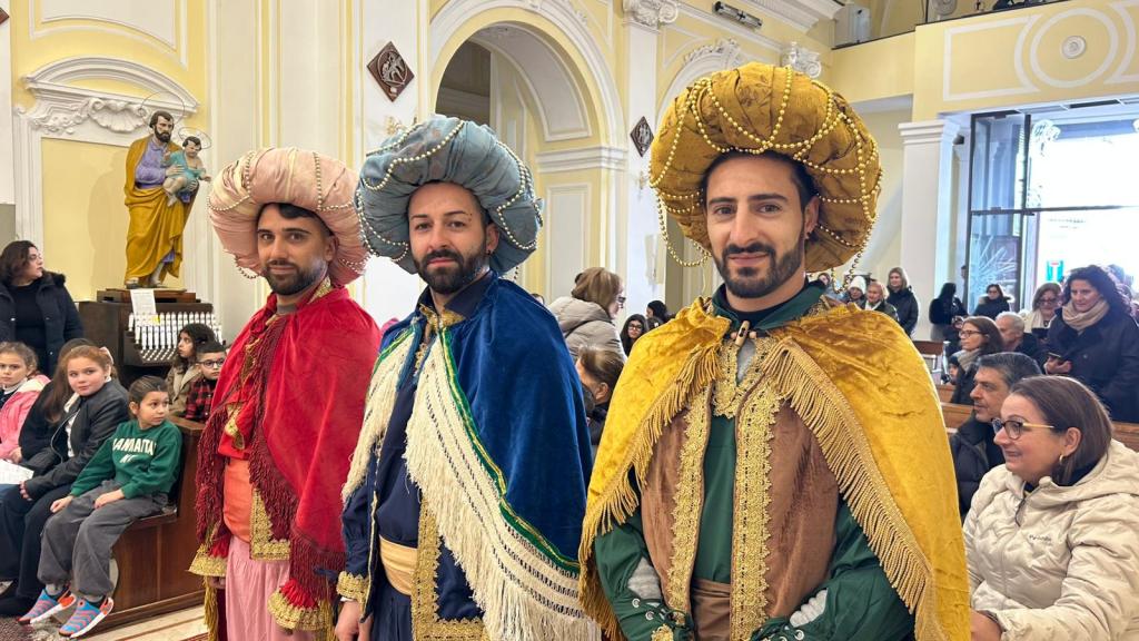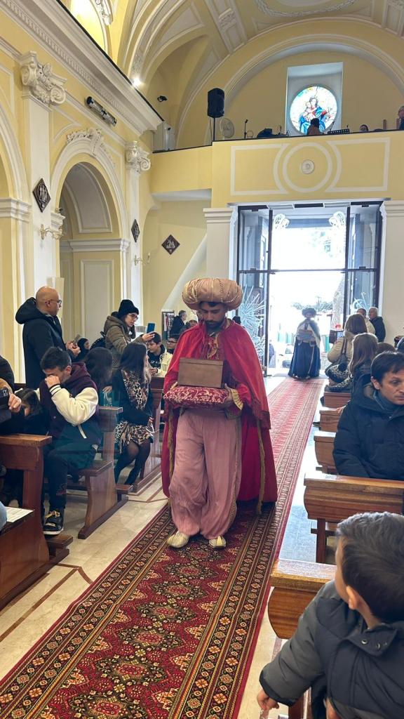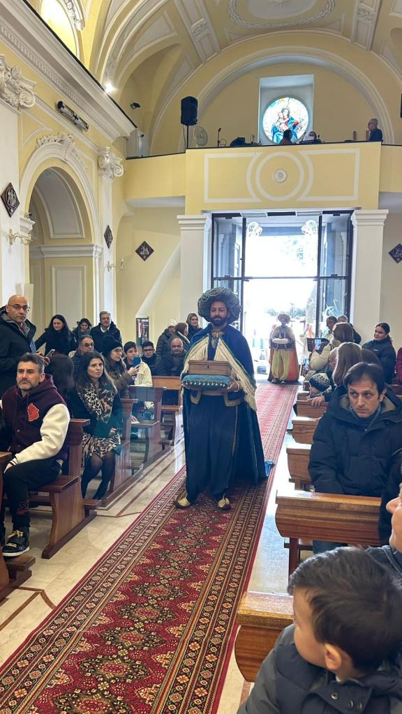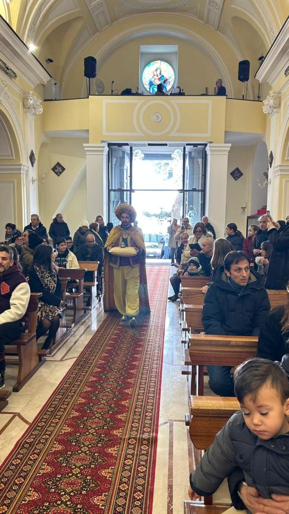 Gaspare, Melchiorre e Baldassarre, dopo aver attraversato la piazza, si sono diretti verso la chiesa portando con sé i doni simbolici: oro, incenso e mirra. Un gesto che ha reso l’atmosfera ancora più solenne, mentre i tre sovrani hanno fatto il loro ingresso in chiesa dove con grande reverenza, hanno deposto i doni ai piedi dell’altare, rendendo omaggio al Bambino Gesù.