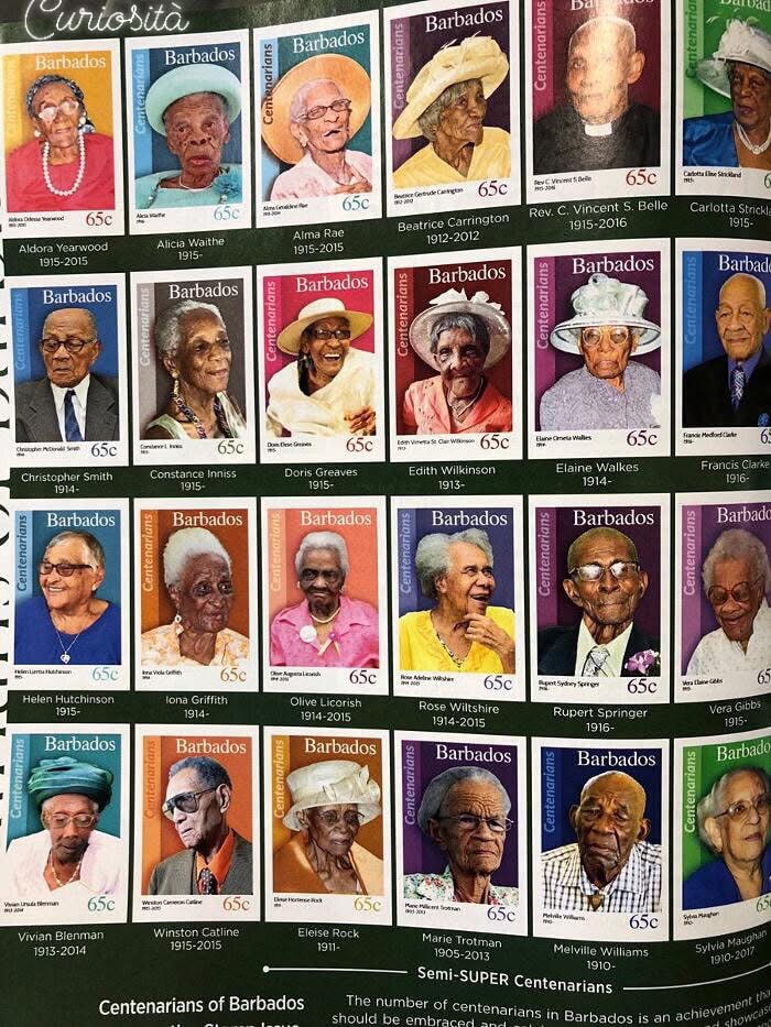 Alle Barbados, il servizio postale celebra i cittadini centenari con una serie di francobolli in edizione limitata raffiguranti 27 centenari, alcuni dei quali deceduti. Ci sono venti francobolli per persone che avevano 100 anni al momento della stampa e sette per chi ha più di 105 anni. Tra questi, la signora Elaine Ometa Walkes, nata nel 1914, ha festeggiato il suo 104° compleanno nel 2018 ed è descritta dal nipote come ancora molto acuta e con una vista incredibile. Anche se la serie non è più disponibile, le immagini possono essere trovate su Barbados Stamps, una risorsa online per collezionisti.