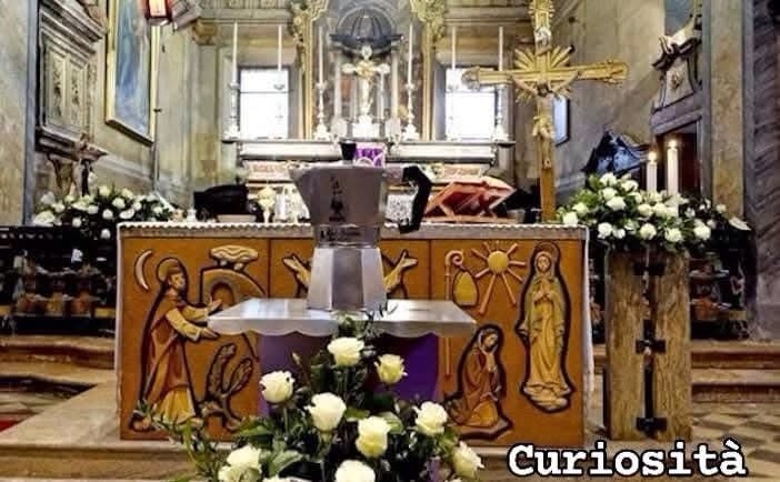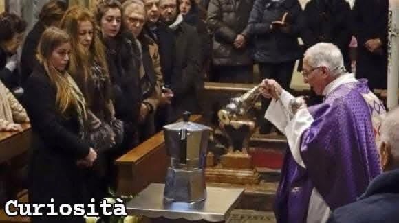 Una Moka davanti all’altare e, dentro, le ceneri di Renato Bialetti, «l’omino coi baffi»: così, per volontà dei figli Alessandra, Antonella e Alfonso, fu salutato a Casale Corte Cerro, nel Verbano, l’industriale che aveva ideato la celebre caffettiera.