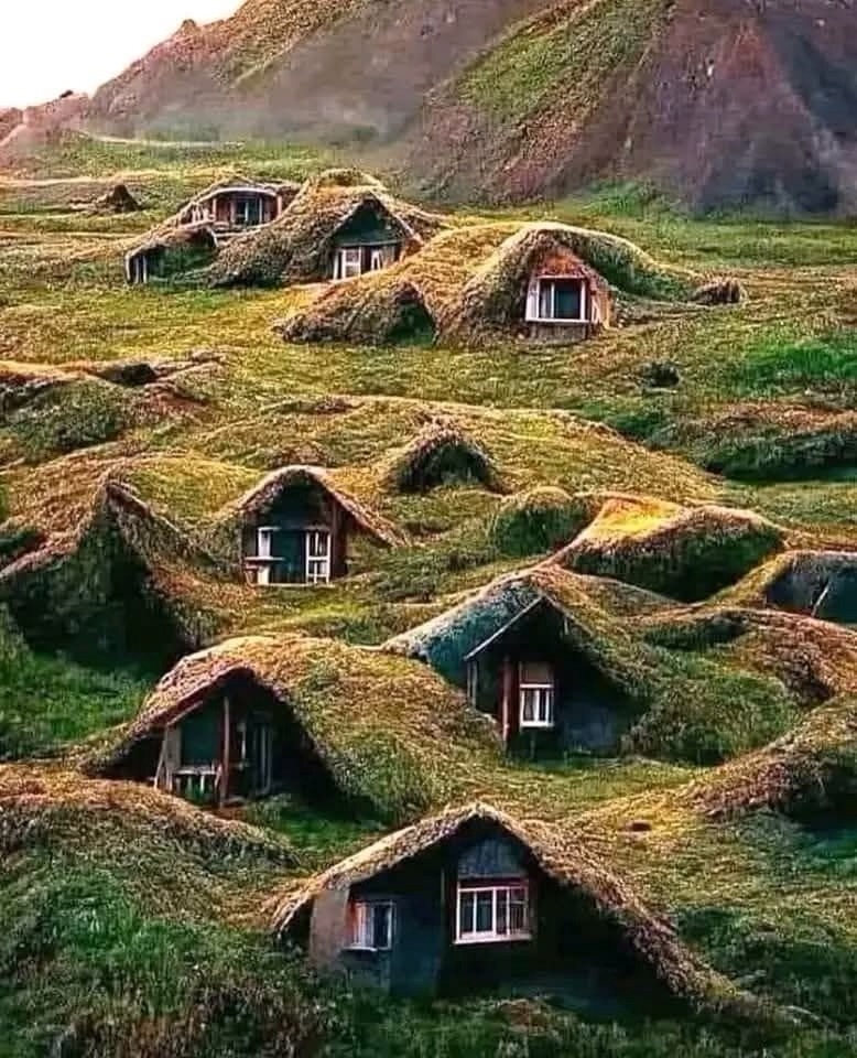 Queste case si trovano in Norvegia, coperte di muschio. Il calore non se ne va mai, il freddo resta fuori. Questa ingegneria è stata realizzata dagli antichi abitanti vichinghi.
