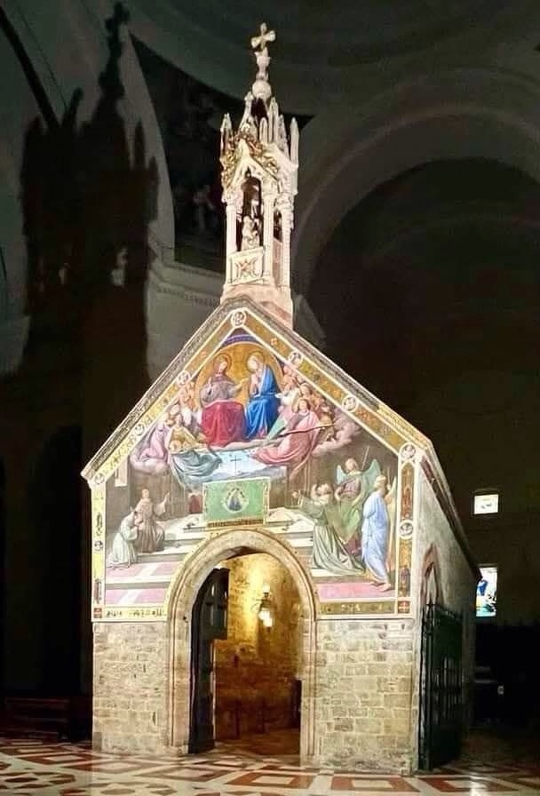 Questa è la Porziuncola la chiesa più piccola al mondo situata all’interno della Basilica di Santa Maria degli Angeli, ed è annoverata tra i luoghi francescani più importanti: tra le sue mura, San Francesco comprese infatti la sua vocazione, accolse santa Chiara e i primi frati, ricevette infine il cosiddetto Perdono di Assisi, divenendo uno dei luoghi prediletti dal santo.