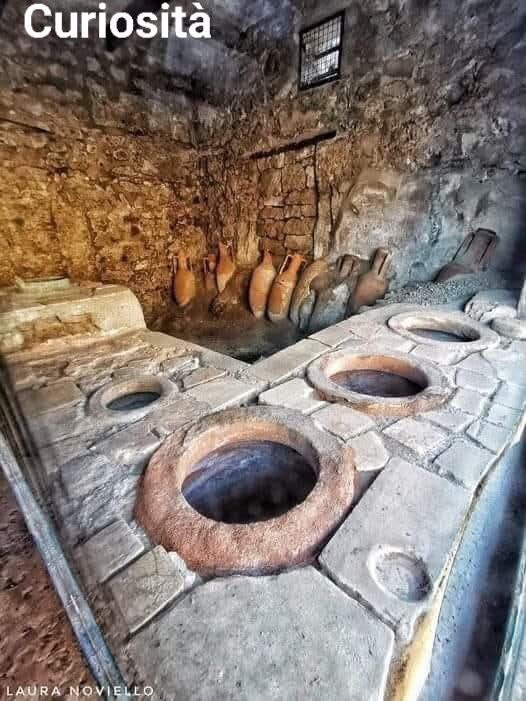 A Pompei, in Via dell’Abbondanza, si trova una “Caupona”, il nome latino che indica la locanda. In questa tavola calda è visibile al piano terra, dietro una facciata ricca di scritte elettorali, un bancone di vendita in muratura nel quale sono inseriti quattro contenitori di terracotta, dove si conservavano cibi cotti.