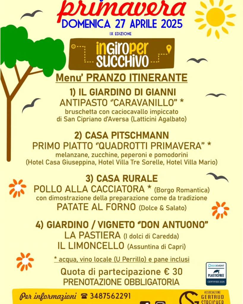 Domenica 27 aprile 2025, Succhivo si veste a festa per accogliere la IX edizione di “In Giro per Succhivo”, il tradizionale evento di primavera che unisce natura, cultura e sapori autentici del territorio. Organizzato dall’Associazione Gertrud Streicher, l’appuntamento è ormai tra i più attesi della stagione sull’isola d’Ischia.