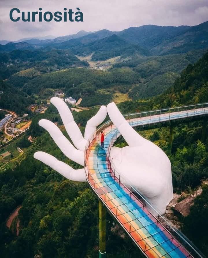 Il ponte color arcobaleno, cullato da una mano gigante, è diventato l’ultima attrazione turistica nel Fujian sud-orientale della Cina. Questo ponte ha anche ricevuto il record di Guinness per essere “la più grande scultura della mano di Buddha al mondo”.