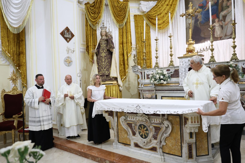 La celebrazione, profonda e intrisa del linguaggio solenne della liturgia antica, è stata presieduta dal Vescovo Mons. Carlo Villano proprio all’inizio del novenario dedicato alla Vergine, in vista della festa del 16 luglio. Una scelta simbolica e potente. A fare gli onori di casa, i sacerdoti Don Franco Mattera, Don Richard e Don Antonio Mazzella, quest’ultimo visibilmente commosso e ispirato, ha concluso la celebrazione con parole che hanno risuonato forti nei cuori: