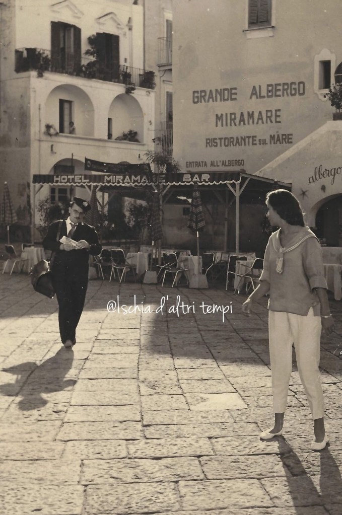 Dagli archivi di “Ischia d’altri tempi” – Ischia Ponte (?). Cartolina non datata e non viaggiata, priva di indicazioni, quasi certamente relativa al set del film “Plein soleil” ossia “Delitto in pieno sole”, pellicola del 1960 interpretata da Alain Delon. Grazie ad un suggerimento pervenutoci da Giovan Giuseppe Cenatiempo, si è visto che effettivamente alcune scene sono state girate ai tavoli di un bar presso il Piazzale Aragonese, con arredi identici a quelli in foto.
