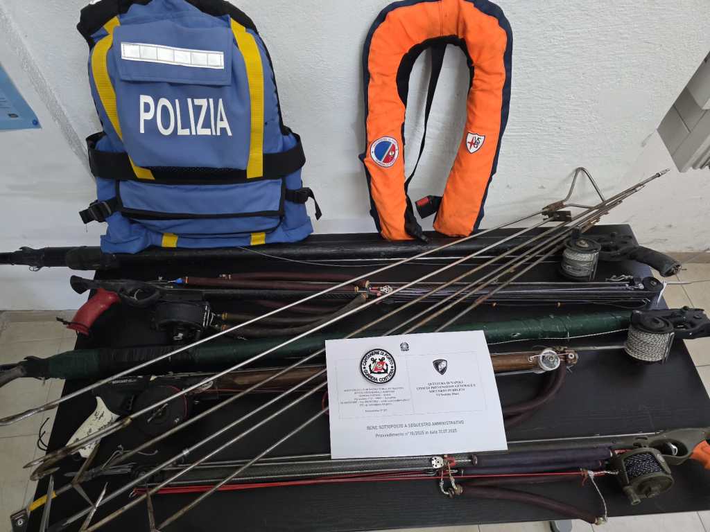 Sul posto è stato intercettato un gommone da diporto con a bordo due subacquei, equipaggiati con un vero arsenale da pesca: 5 fucili subacquei, 10 fiocine e un raffio. Gli individui sono stati identificati, sanzionati e le attrezzature sottoposte a sequestro ai fini della confisca.