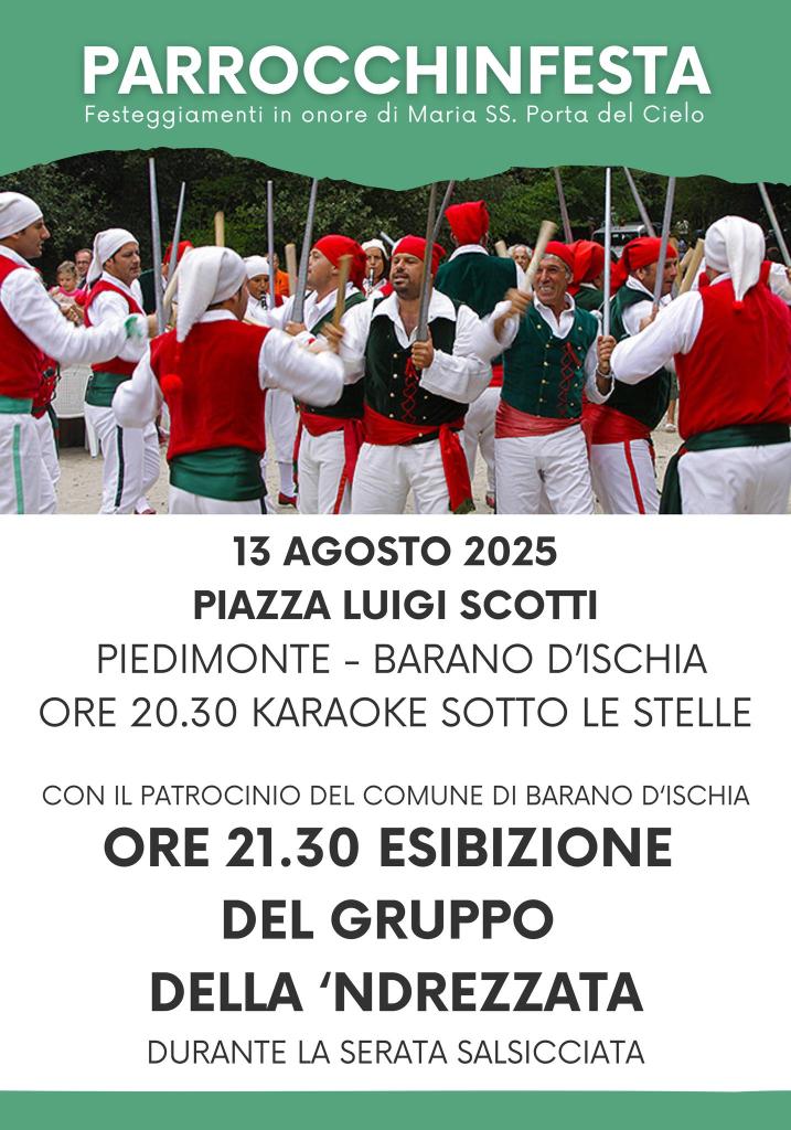 E stasera alle ore 20:30 sempre in piazza a Piedimonte ci sarà il karaoke sotto le stesse e a seguire alle 21:30 l’Esibizione del gruppo della ‘ndrezzata il tutto accompagnata dalla classica salsicciata.
