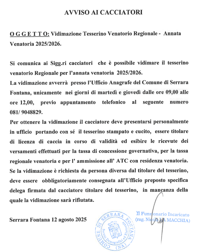 Il Comune di Serrara Fontana informa i cittadini che è ufficialmente avviata la procedura di vidimazione del tesserino venatorio regionale per l’annata 2025/2026.