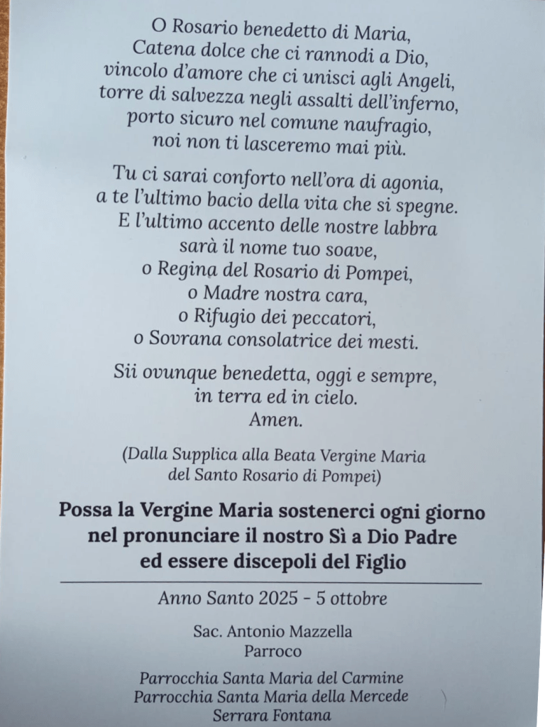 Siamo certi che, con la supplica della Madonna di Pompei, a cui il Vescovo Carlo ha affidato la guida in questo cammino, Don Antonio saprà condurre la comunità con dedizione e fede.