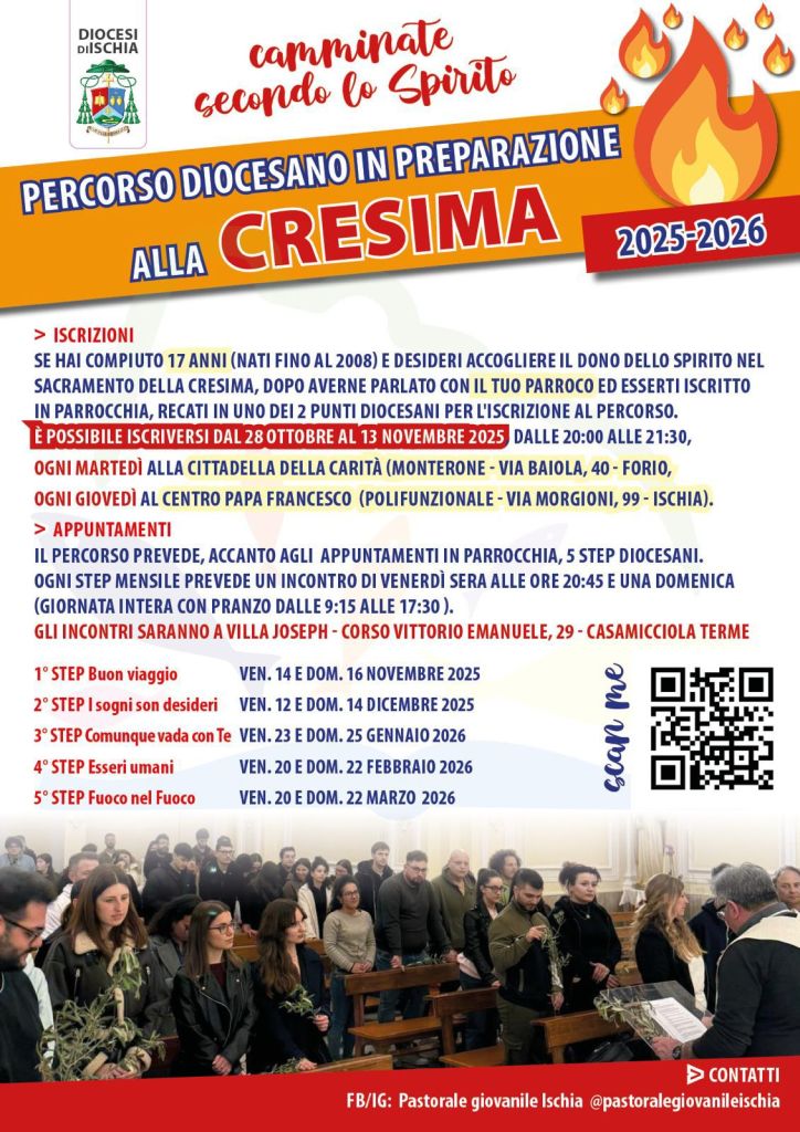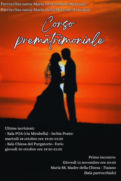 Due importanti percorsi di fede e formazione spirituale si aprono nelle prossime settimane per i giovani e le coppie dell’isola d’Ischia: i corsi prematrimoniali organizzati dalle Parrocchie di Santa Maria del Carmine (Serrara) e Santa Maria della Mercede (Fontana) e il percorso diocesano di preparazione alla Cresima 2025-2026.