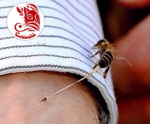 In questa immagine impressionante, un’ape mellifera (🪶 Apis mellifera) perde il pungiglione insieme a parte del suo apparato digerente dopo aver punto.