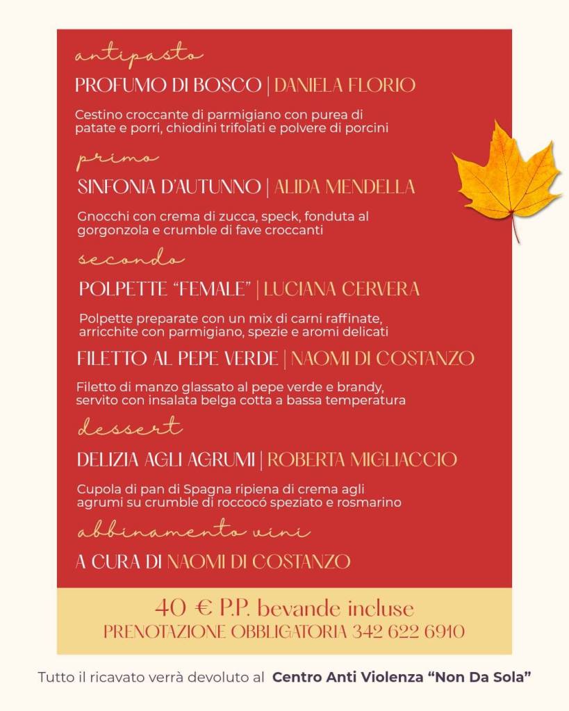 L’intero ricavato della serata sarà devoluto al Centro Antiviolenza “Non Da Sola”, realtà impegnata sul territorio nel supporto alle donne vittime di violenza e nella promozione di percorsi di autonomia e rinascita.