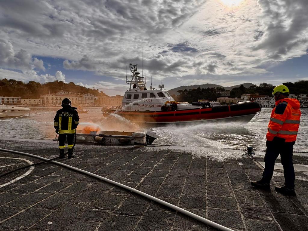 ISCHIA PORTO – Fumo denso che si alza da un’imbarcazione, sirene che risuonano nel porto, mezzi di soccorso che convergono rapidamente verso il punto dell’emergenza. Questa mattina il Porto di Ischia si è ritrovato immerso in quella che sembrava a tutti gli effetti un’emergenza incendio. Ma niente panico: si è trattato di un’esercitazione.