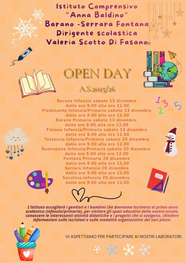 L’Istituto Comprensivo “Anna Baldino” in cui ricadono i plessi scolastici di Barano e Serrara Fontana apre le sue porte alle famiglie del territorio con un articolato programma di Open Day per l’anno scolastico 2025/26. Un’opportunità preziosa per i genitori che si preparano a iscrivere i propri figli al primo anno della scuola dell’infanzia o della primaria, guidati dalla Dirigente Scolastica Valeria Scotto Di Fasano.