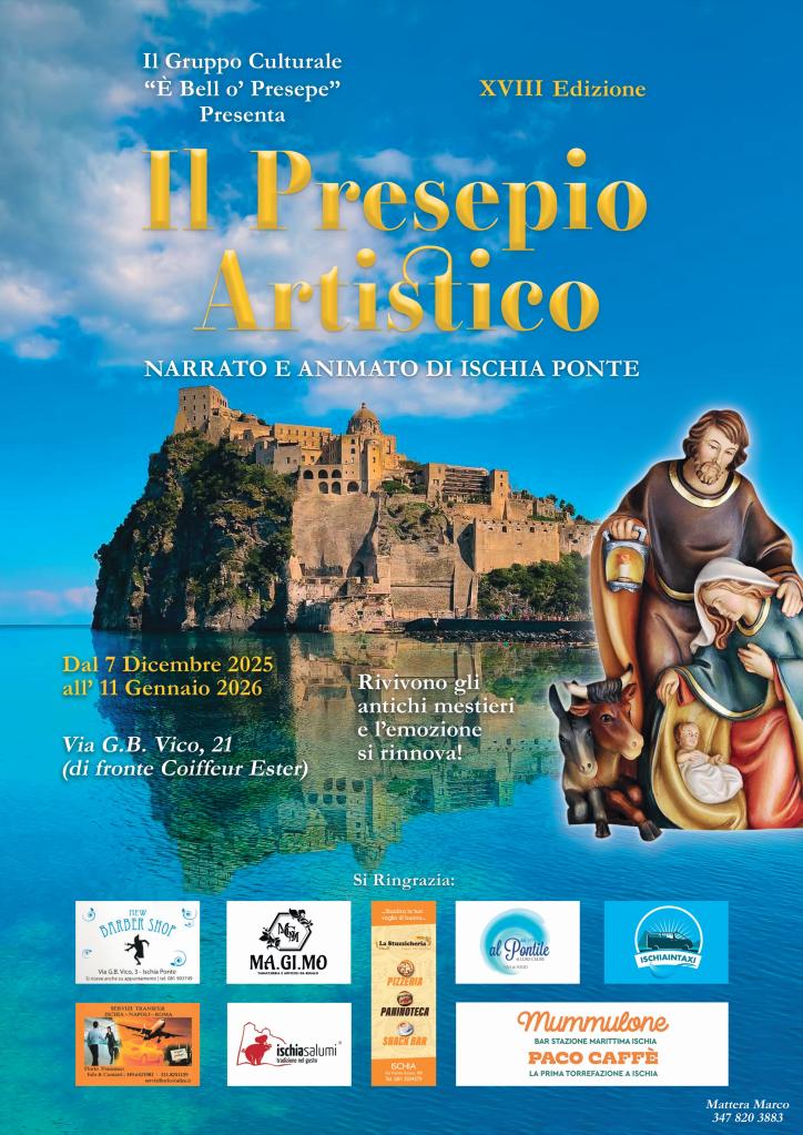 La magia del Natale torna a risplendere a Ischia Ponte con la XVIII edizione del Presepio Artistico narrato e animato, una delle rappresentazioni più amate e attese del periodo natalizio. L’iniziativa, curata dal Gruppo Culturale “È Bell o’ Presepe”, sarà visitabile dal 7 dicembre 2025 all’11 gennaio 2026 in via G.B. Vico, 21, proprio di fronte a Coiffeur Ester.
