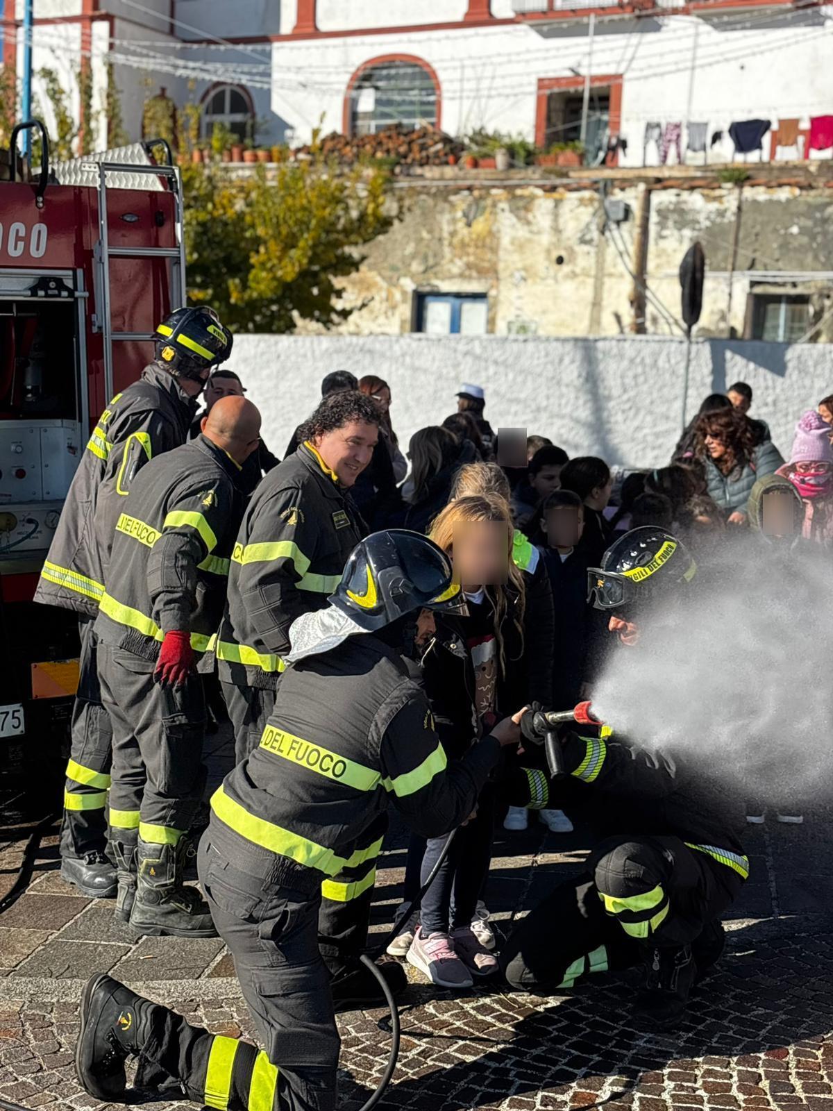 La mattinata si è aperta in piazza Pietro Paolo Iacono con il primo evento dedicato ai festeggiamenti in onore di Santa Barbara, patrona dei Vigili del Fuoco. Un inizio speciale soprattutto per i bambini della scuola primaria di Fontana, che hanno potuto vivere da vicino un’esperienza unica: una piccola ma significativa dimostrazione pratica su come comportarsi in caso di incendio, condotta proprio dai loro “paladini”, i Vigili del Fuoco.