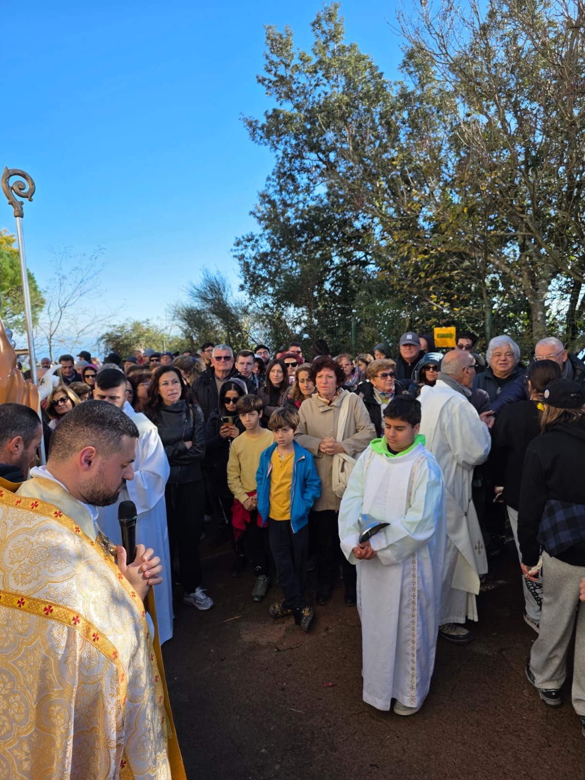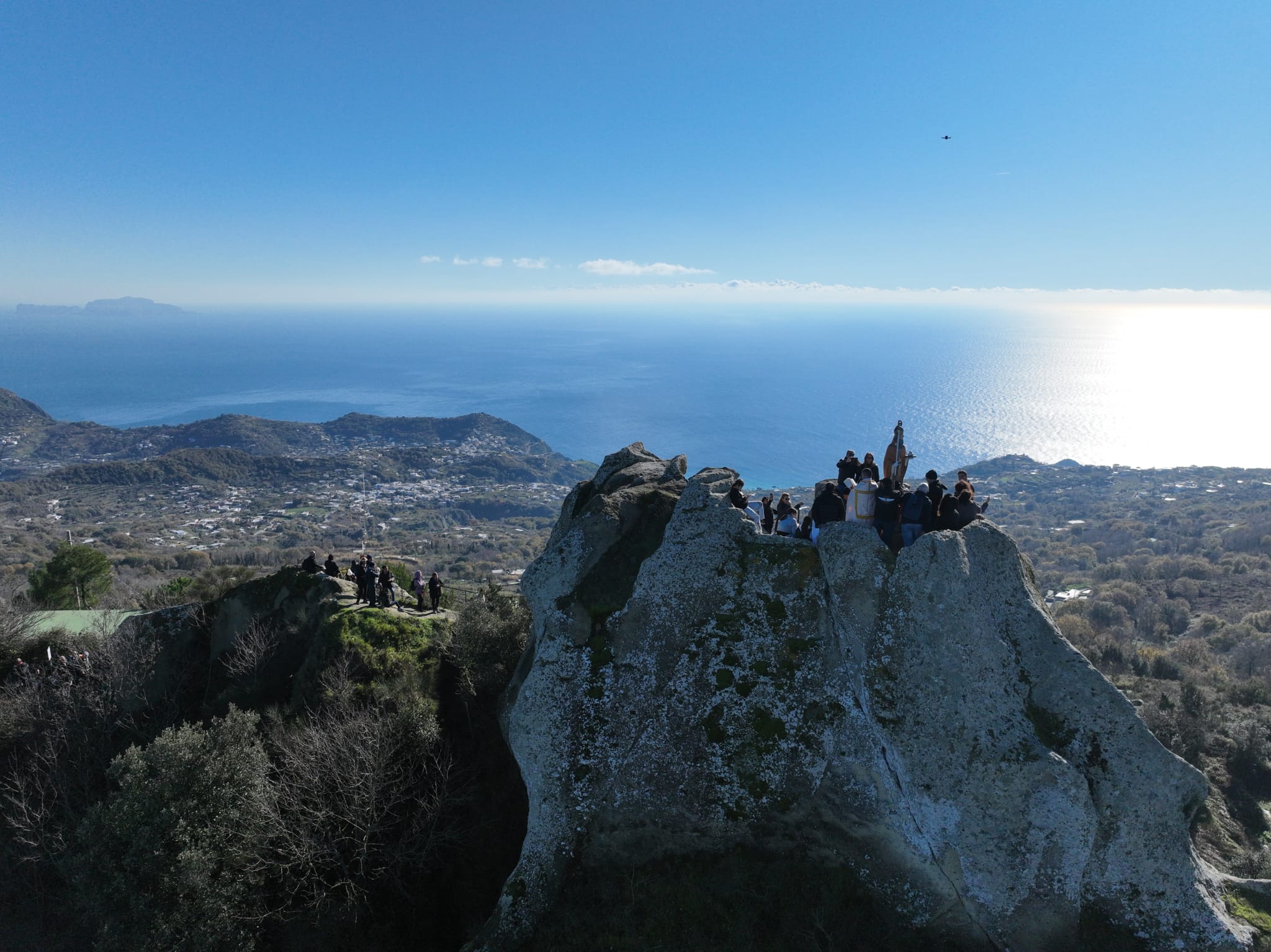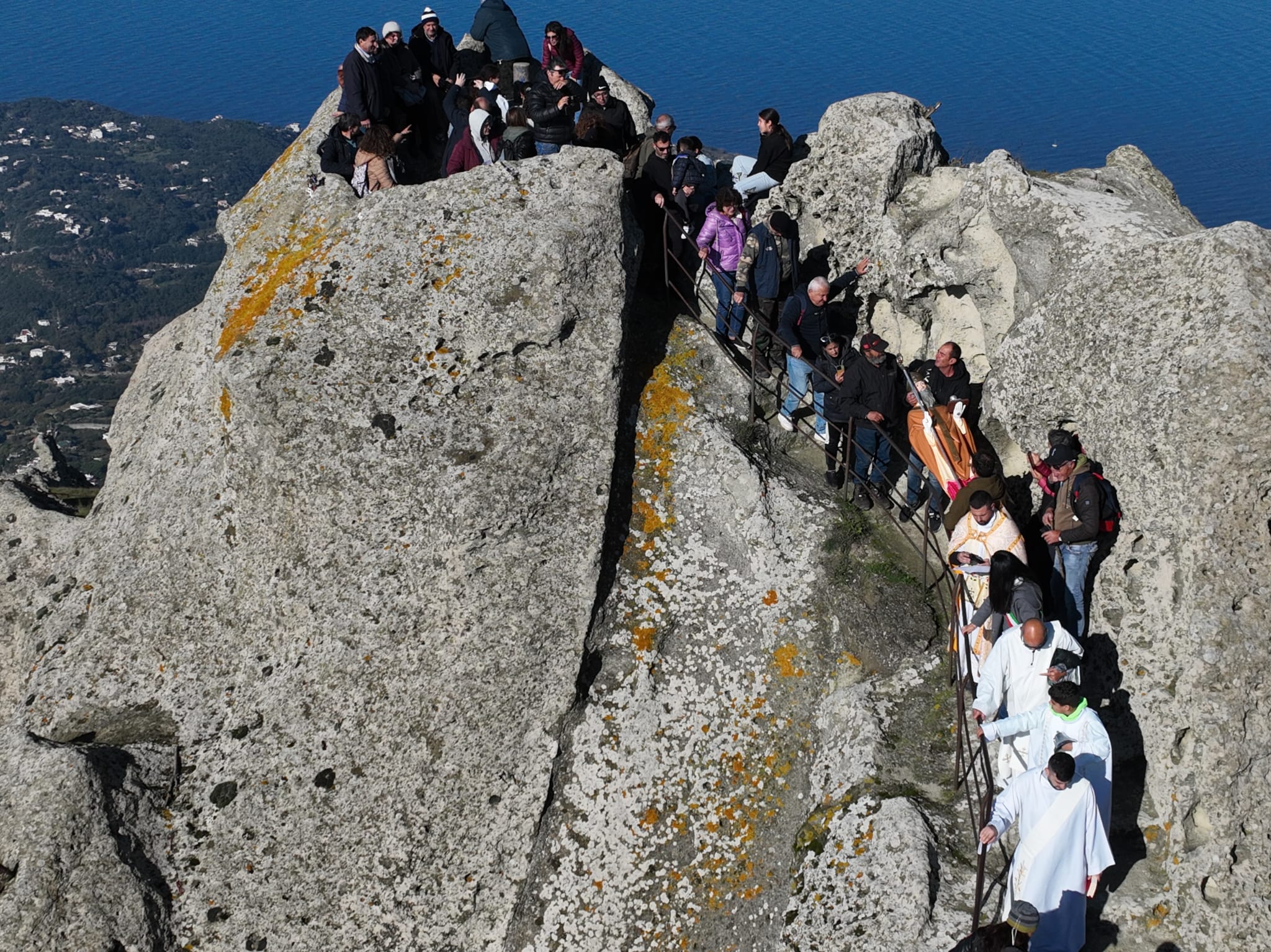 Il momento più toccante è arrivato quando don Antonio Mazzella, parroco di Serrara Fontana, ha impartito la benedizione all’intera isola dall’Epomeo. Un gesto che richiama un’antica consuetudine: un tempo, gli eremiti che vivevano in quell’eremo uscivano all’alba e, da quello stesso punto, benedicevano ogni giorno l’isola, affidandola alla protezione del cielo.