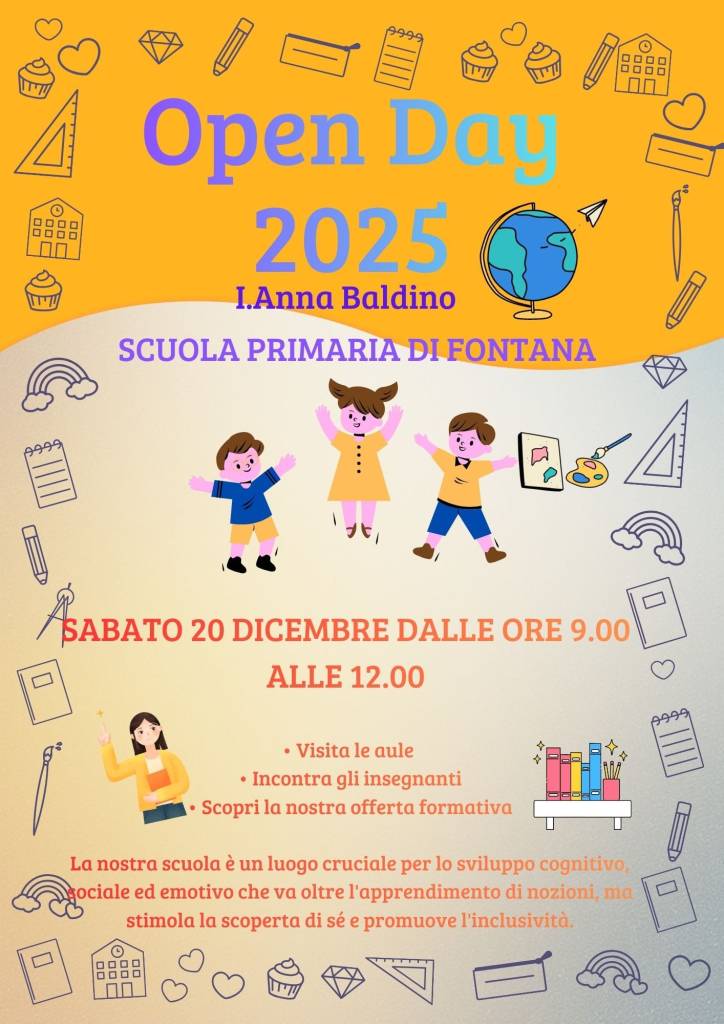 Sabato 20 dicembre, dalle ore 9.00 alle 12.00, la Scuola Primaria di Fontana dell’Istituto Comprensivo “Anna Baldino” aprirà le sue porte a famiglie, bambini e cittadini in occasione dell’Open Day 2025.