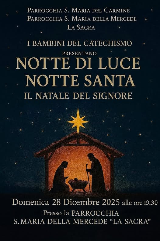 Domenica 28 dicembre 2025, alle ore 19:30, presso la Parrocchia di Santa Maria della Mercede “La Sacra”, i bambini del catechismo presenteranno “Notte di Luce, Notte Santa – Il Natale del Signore”, un momento di riflessione e condivisione aperto a tutta la comunità.