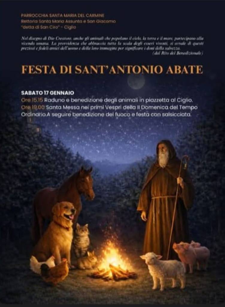 Giorno 17 gennaio alle ore 15.15, presso la piazzetta del Ciglio, si terrà il raduno e la benedizione degli animali. Alle ore19, si terrà la santa messa nei primi Vespri della III domenica del tempo ordinario e a seguire, benedizione del fuoco e festa con salsicciata.