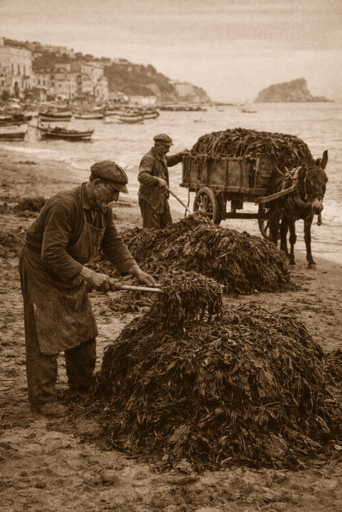 Il raccoglitore lavorava all’alba, con forche di legno e corde, caricando le alghe su carretti o asini. Era un mestiere faticoso, legato al ritmo del mare e delle stagioni, ma prezioso in un’isola dove nulla si sprecava.